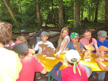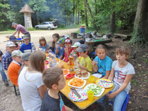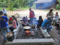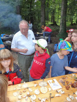 In Gruppen ging es kreuz und quer durch den Wald und jeder Fund wurde sofort besprochen und eingepackt. Gegen Mittag traf man sich bei der Waldhütte zum Apèro und der Besprechung des ganzen Pilzfundes durch unsere Experten. Die Kinder lernten so Grundbegriffe wie Lamellen-, Röhren- oder Porenpilze, Holzpilze oder warum Pilze zusammen mit Bäumen wachsen. Danach gab es Pilzrisotto und Würstchen vom offenen Feuer, von den Kursleitern Fränzi und Claus Maler bestens zubereitet. Der Nachmittag wurde abgeschlossen mit verschiedenen Pilzspielen und Wettbewerben und einem obligatorischen „Familienfoto“.